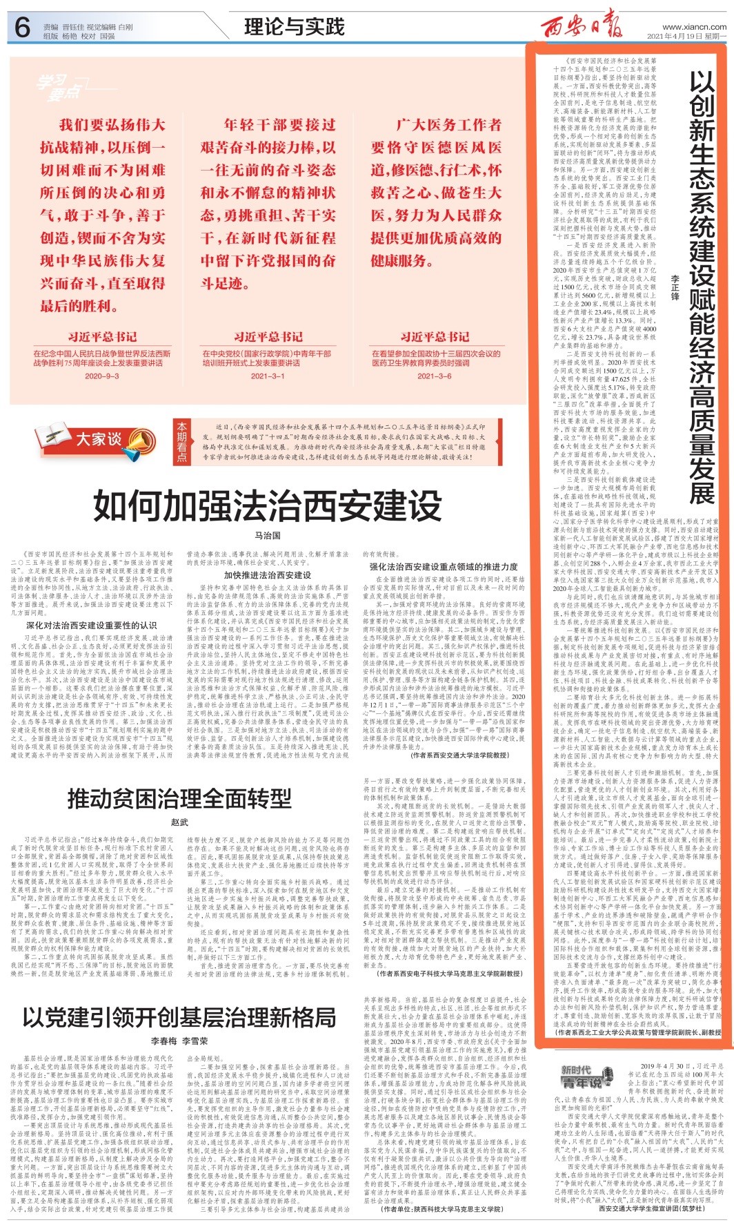近日,《西安市国民经济和社会发展第十四个五年规划和二零三五年远景目标纲要》正式印发。太阳成集团tyc122ccvip副经理李正锋就如何建设创新生态系统赋能西安经济高质量发展进行了理论解读和探讨。文章发表于4月19日《西安日报》“理论与实践”栏目中。