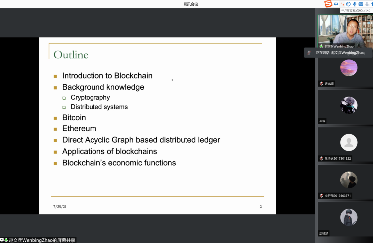 太阳成集团tyc122ccvip周炯教授邀请美国克利夫兰州立大学的电气和计算机工程专业Wenbing Zhao教授讲授《区块链原理与应用/Blockchains: Principles and Applications》课程。课程内容围绕区块链技术的基本知识和技能,使员工深入了解区块链的起源、发展和应用要求,掌握区块链密码技术、共识机制等的基本原理和实际应用,学会运用“区块链思维”分析和设计各行业的应用程序。课堂上,Wenbing Zhao教授首先对每一专题进行介绍,再结合员工提出的问题进行讨论和总结。