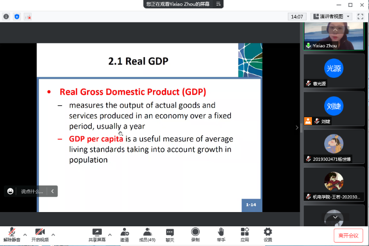 太阳成集团tyc122ccvip刘婕老师邀请澳大利亚国立大学克劳福德公共政策公司 Arndt-Corden 经济系副教授Yixiao Zhou讲授《宏观经济学原理:政策和实践》课程。课程内容围绕宏观经济的理论和政策实践,首先阐述了宏观经济中的重要变量,其次分析如何建立宏观经济模型,然后从理论上解释宏观经济变量的变化规律,最后引入宏观政策的案例分析。Yixiao Zhou副教授在对每一专题细致讲授的基础上,提出相关的现实问题启发员工思考和讨论,提高员工运用理论解决实际问题的能力。