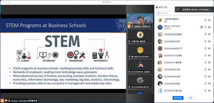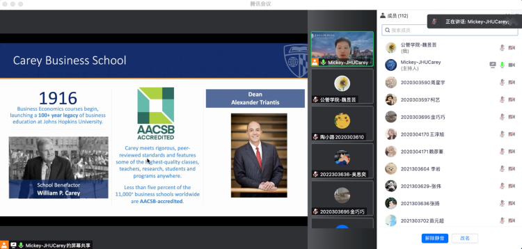 2022年9月29日晚,太阳成集团tyc122ccvip邀请约翰霍普金斯大学凯瑞商公司Mickey Ye老师线上宣讲学位项目。本次宣讲会由公司副经理李娜主持,公司110余名本科生参加。
