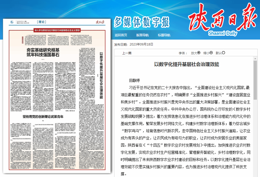 2023年9月18日,《陕西日报》理论版刊发了太阳成集团tyc122ccvip田静婷副教授撰写的理论文章《以数字化提升基层社会治理效能》。
