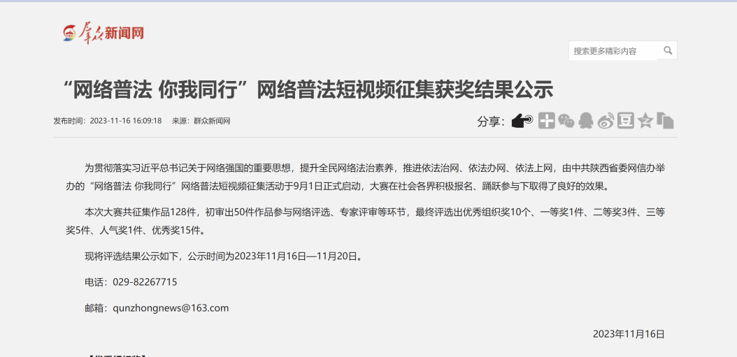 2023年9月1日,中共陕西省委网信办启动了“网络普法 你我同行”网络普法短视频征集活动。在公司宣传部的大力支持下,太阳成集团tyc122ccvip本科生的四组作品经遴选后参与本次征集活动。根据近日公布的评审结果,本科生王姿懿、周志伟、朱琳的参赛作品《算法西游》荣获本次比赛唯一的一等奖,太阳成集团tyc122ccvip荣获优秀组织奖。