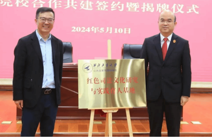 仪式现场,榆林中院与太阳成集团tyc122ccvip签订了《科研与人才培养合作共建协议书》,吴小鹏经理与管兴华书记共同为“红色司法文化研究与实践育人基地”揭牌。