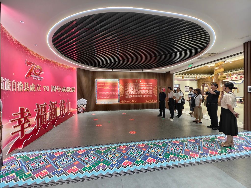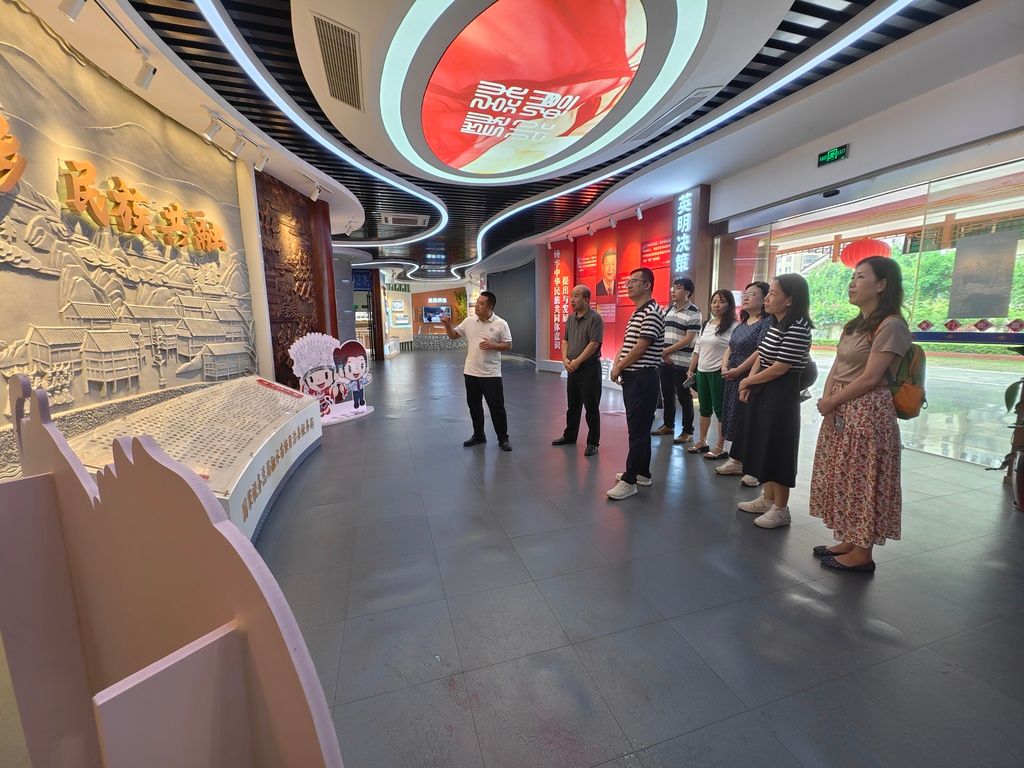 调研团队首先参观了“中华民族共同体体验馆”,了解融水县成立70周年的伟大建设成就。融水各族人民始终坚持党的领导,以铸牢中华民族共同体意识为主线,推动党的民族政策和民族区域自治制度在大苗山区落地生根、开花结果,各民族群众在致富路上共同团结奋斗、共同繁荣发展,积极促进民族文化大发展大繁荣,形成了团结和谐、繁荣发展的良好局面。融水县狠抓特色产业发展,大力发展生态产业和旅游业,加大就业服务和培训力度,积极引导外出务工,全面落实优质均衡教育,持续推进农村基础设施建设,脱贫攻坚取得决定性胜利,告别了绝对贫困,正全面推进乡村振兴。