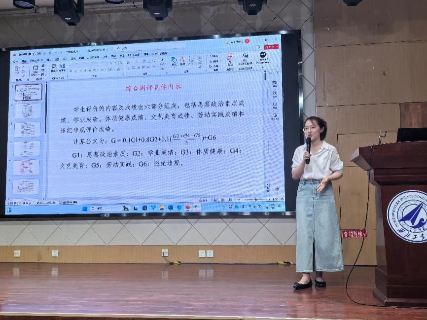 杨斯悦为同学们介绍了综测的概念、算法以及意义,依据综测文件讲解了各个加权项的权重以及涵括内容,并详细解说了获得相应分数的活动名称、参与方式等,她鼓励同学们全方位发展。张悦对讲解内容进行了补充,提醒同学们稳扎稳打、提升个人综合素养。