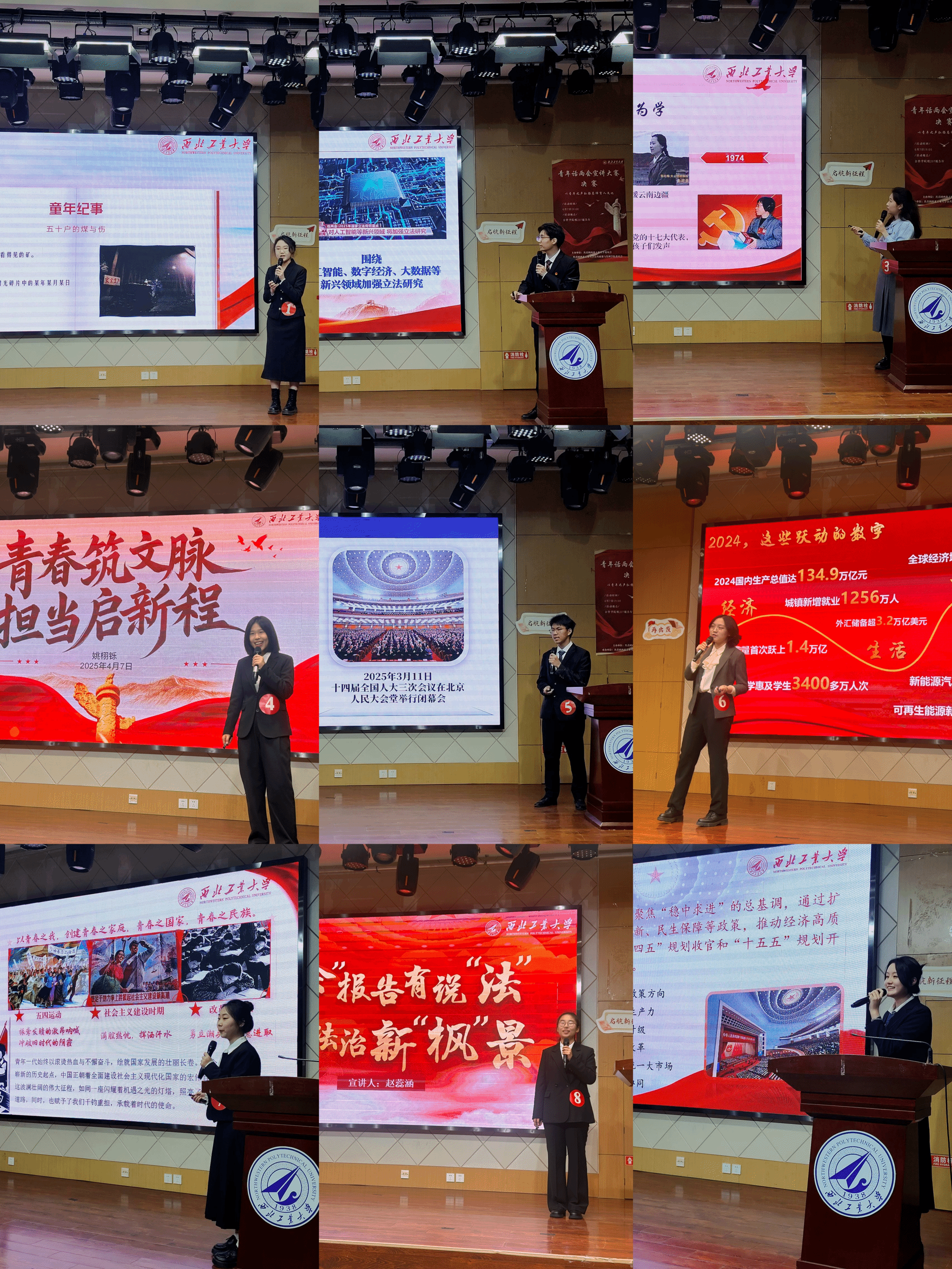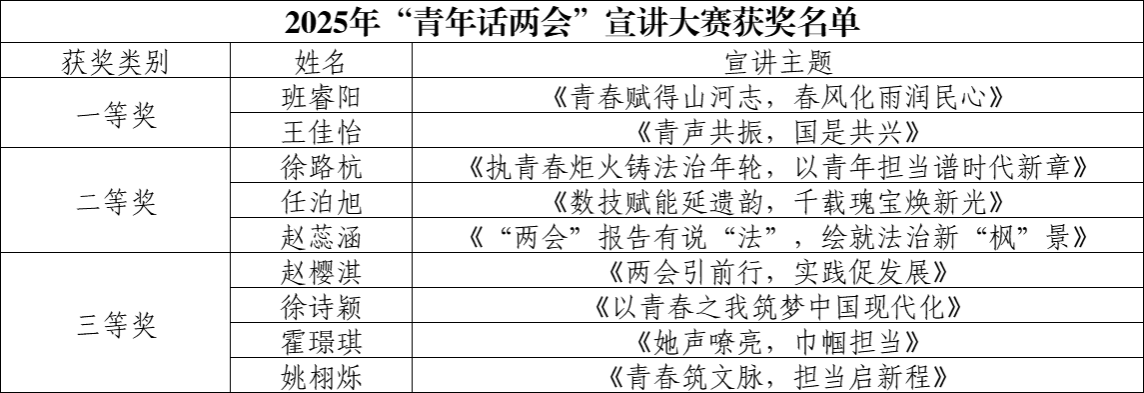 评委组从政策把握、逻辑架构、宣讲实效等维度综合评分,最终评选出一等奖2名、二等奖3名、三等奖4名。管兴华在总结讲话中指出,本次活动是落实“时代新人铸魂工程”的创新实践,充分肯定了参赛学子以青年视角解读政策要义、用创新表达传递两会声音的显著成效。勉励青年学子持续跟踪时政热点,心怀“国之大者”,在全局高度思考社会发展命题,将理论学习成果转化为服务国家战略的实践行动,为建设中国式现代化贡献青春智慧,听党话、跟党走,用青春书写时代华章!