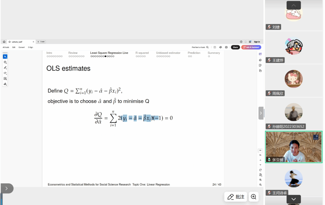 刘婕副教授邀请牛津大学高级研究员Yanan Zhang高级研究员讲授《社会科学研究计量与统计方法/Econometrics and Statistical Methods for Social Science Research》课程。课程系统介绍计量经济学与高级统计方法,融合理论讲解与实际操作。内容涵盖线性回归、广义线性模型、工具变量法、面板数据分析(固定效应与随机效应)、倾向得分匹配(PSM)以及双重差分法(DID)等关键方法,帮助员工掌握实证研究中的核心技能,提升数据分析与研究设计能力。