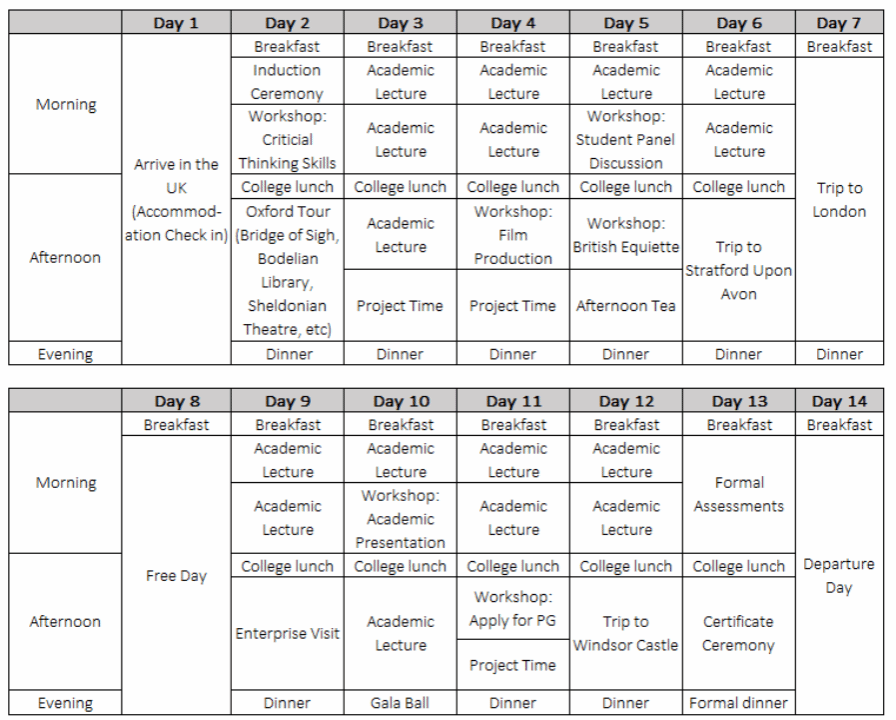 项目费:2850英镑/人。其中包含:学费,课程材料,一日三餐(周日仅早餐),结业晚宴&舞会,参访门票及交通,接送机等;