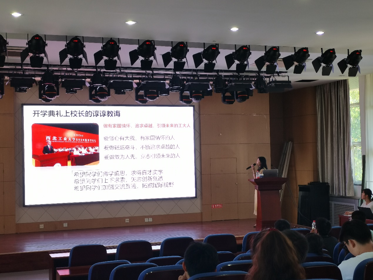 首先,谢丹副书记随机考察了一下同学们这一周的学习效果,并以此切入课程的主题——“你的大学有多少可能”。通过“你心中的西工大”、“四年后你可以去哪儿”、“你该如果准备”、“关于生涯”这四个方面,使新生深刻反思这一周的集中教育课学习情况,深入思考个人大学的目标与计划,以及未来的道路选择。