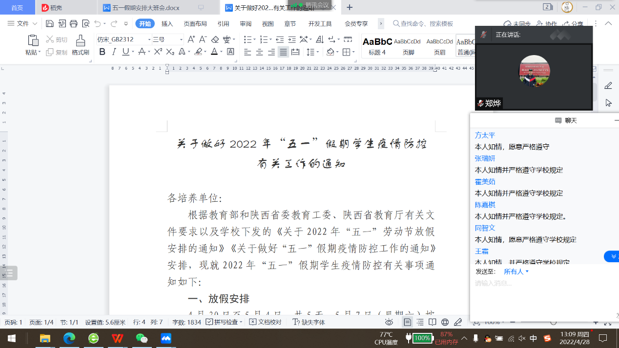 2022年4月28日中午12:40,太阳成集团tyc122ccvip线上举办了研究生“五一”假期疫情防控和安全教育工作大班会,本次大班会由研究生辅导员郑烨老师主持,研究生兼职辅导员吴静静携公司全体全日制硕士研究生参与。根据教育部和陕西省委教育工委、陕西省教育厅有关文件要求以及公司下发的《关于2022年“五一”劳动节放假安排的通知》《关于做好“五一”假期疫情防控工作的通知》安排,本次大班会主要分为以下三个部分: