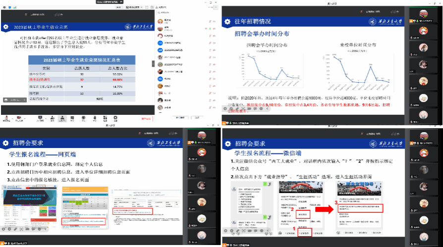 首先介绍的是学院近三年毕业生的就业去向、就业率和就业总体状况,结合近期的23届毕业生就业意愿摸排情况,建议同学们要做好多手准备,多管齐下应对就业。大家可以通过微信公众号“西工大就业”、就业信息网站以及微信群内发布的“每日就业信息汇”等多种途径预约参加招聘会,全面搜索就业讯息。最后,通过清晰的流程图,郑烨整点讲解了签约平台的使用,如何办理三方签约,以及集团就业中心的相关职能等。