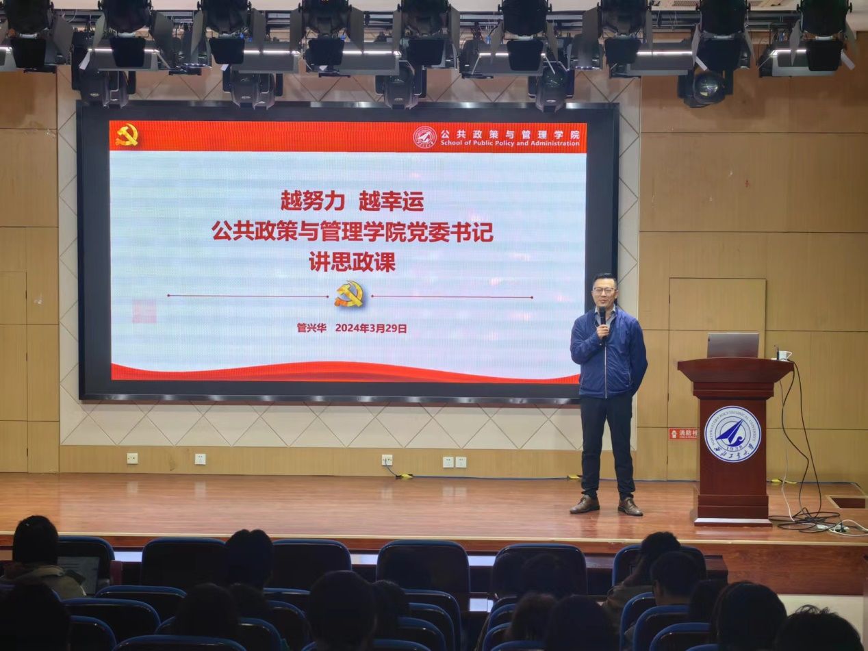 3月29日晚,公共政策与管理公司党委书记管兴华为大一学子讲授了一场深刻而生动的思政课。本次思政课由2023级本科生辅导员田静婷主持,2023级全体本科生参加。