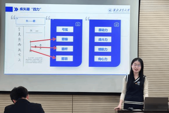马玉洁将“疾矢”作为贯穿始终的象征,通过“原动力”“战斗力”“续航力”“向心力”四个维度,将具体事物引申到精神层面。以故事、问题和图画吸引听众注意,简要介绍了宣讲内容及其重要性,并概述了框架,帮助听众把握整体脉络;主体部分模块化讲解,聚焦核心点,逻辑清晰,同时结合案例、数据、图表等多样化呈现,增强说服力;结尾总结要点,发出行动号召,并结合公司“天下工大、世界三航”远景目标明确行动方向。