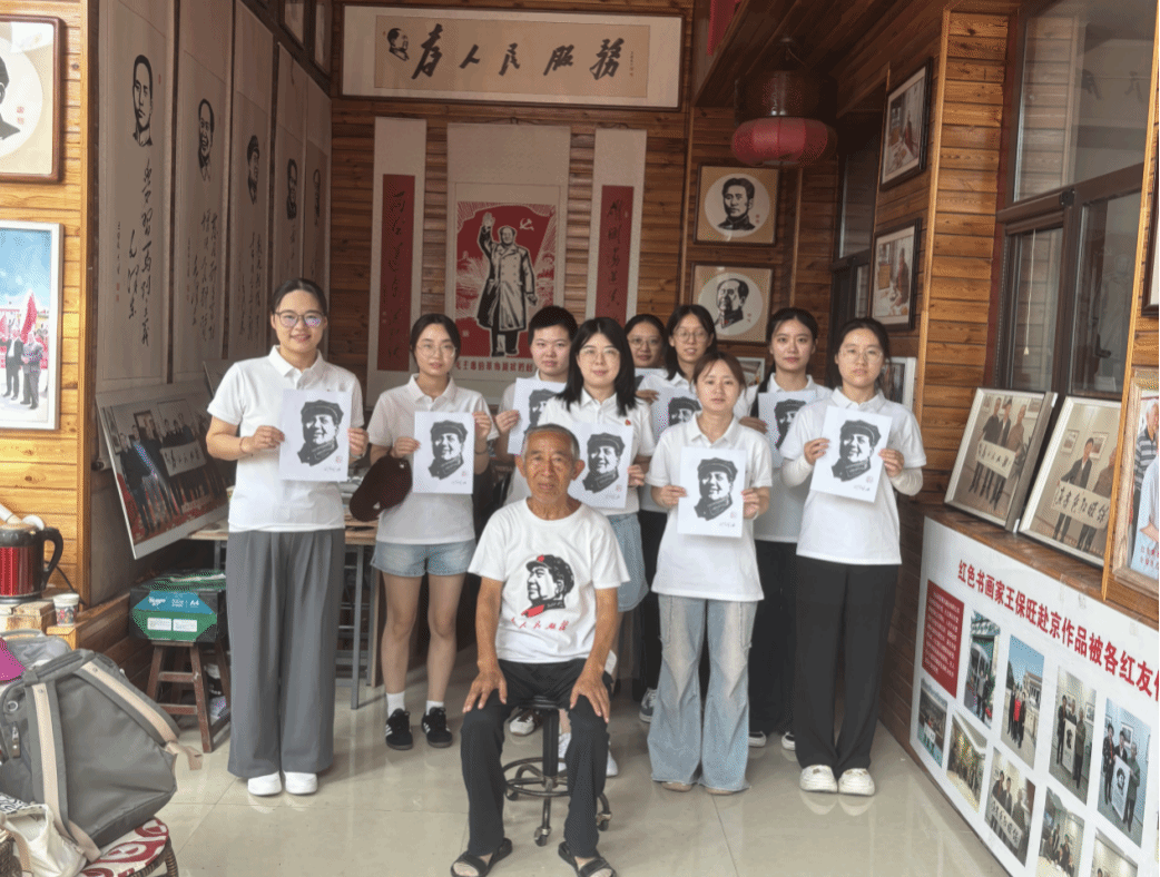在刘家堡村,队员们走进王保旺家中。被誉为“三晋红色书画第一人”的王保旺先生,五十余载深耕毛泽东肖像版画创作与毛体书法研究,已刻制涵盖毛主席不同历史时期的木版肖像作品60余幅,并矢志创作主席全身像刻作。他深情地为实践队员讲解每幅作品背后的峥嵘岁月与历史深意。临别之际,王先生向实践队每位成员赠送了一份他亲手创作的毛主席木版拓画像复刻版画。