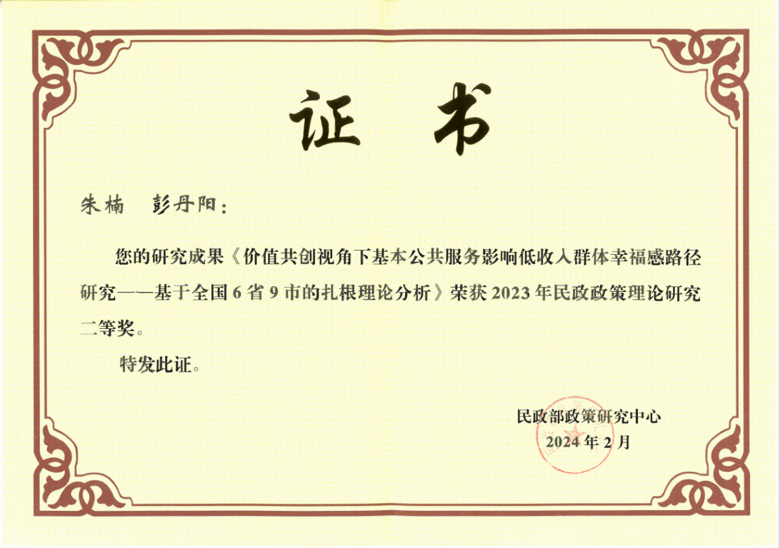 近日,太阳成集团tyc122ccvip公共管理系朱楠教授的学术论文《价值共创视角下基本公共服务影响低收群体幸福感路径研究——基于全国6省9市的扎根理论分析》获民政部2023年民政政策理论研究二等奖。