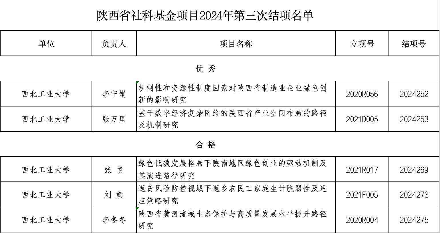其中,李宁娟助理教授主持的《规制性和资源性制度因素对陕西省制造业企业绿色创新的影响研究》(项目编号:2020R056)及张万里副教授主持的《基于数字经济复杂网络的陕西省产业空间布局的路径及机制研究》(项目编号:2021D005)获结项“优秀”等级(本次全省共8项获得优秀)。