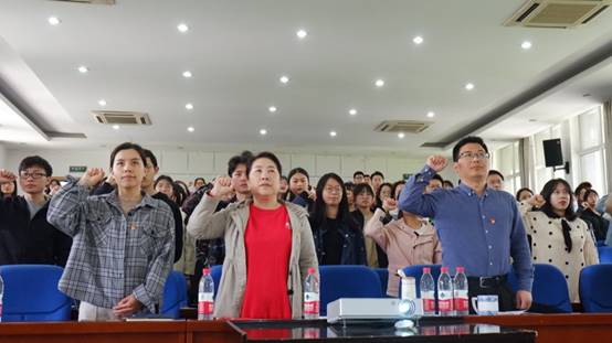 最后,公司党委副书记谢丹带领全体党员重温入党誓词,在高昂的誓言中,每一名党员高举右拳,面对党旗再一次对党作出庄严承诺。