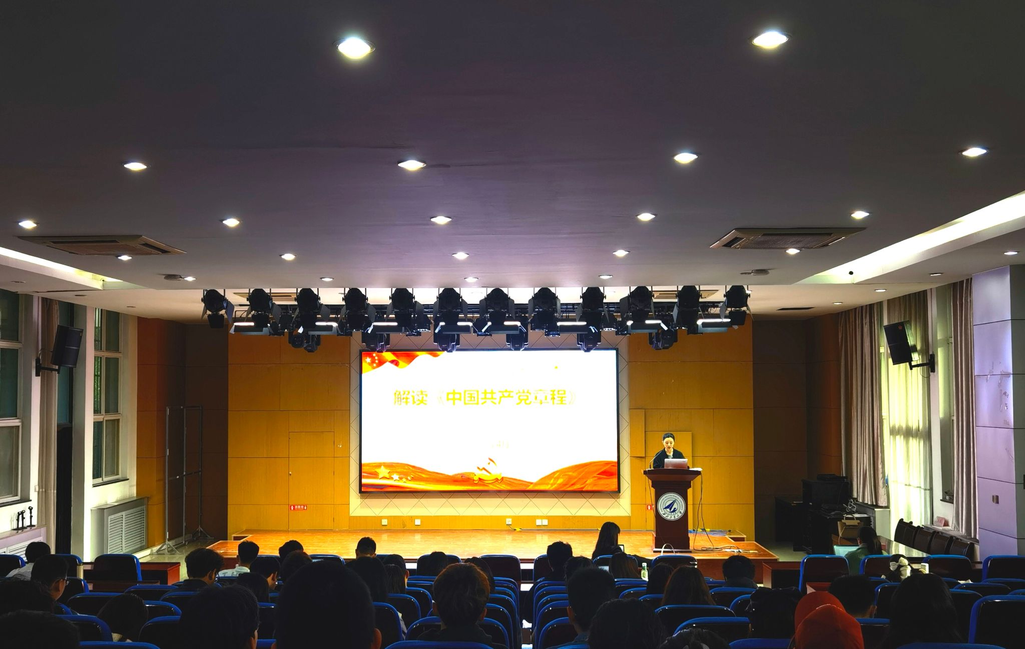 谢丹副书记从党章在党的建设中的地位和作用、党章的主要内容结构、党章的产生、发展和历次修改以及二十大党章的重要修改等四个方面进行了详细讲解。