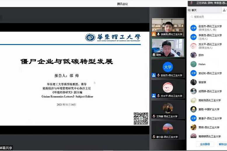 来自华东理工大学的邵帅教授是国家优秀青年科学基金获得者,国家社科基金重大项目首席专家,国家级青年人才,主要研究领域为能源与环境经济学。在Nature子刊、《经济研究》、《管理世界》等发表诸多研究成果。此次学术研讨分享的主题为“僵尸企业与低碳转型发展”。