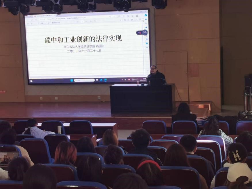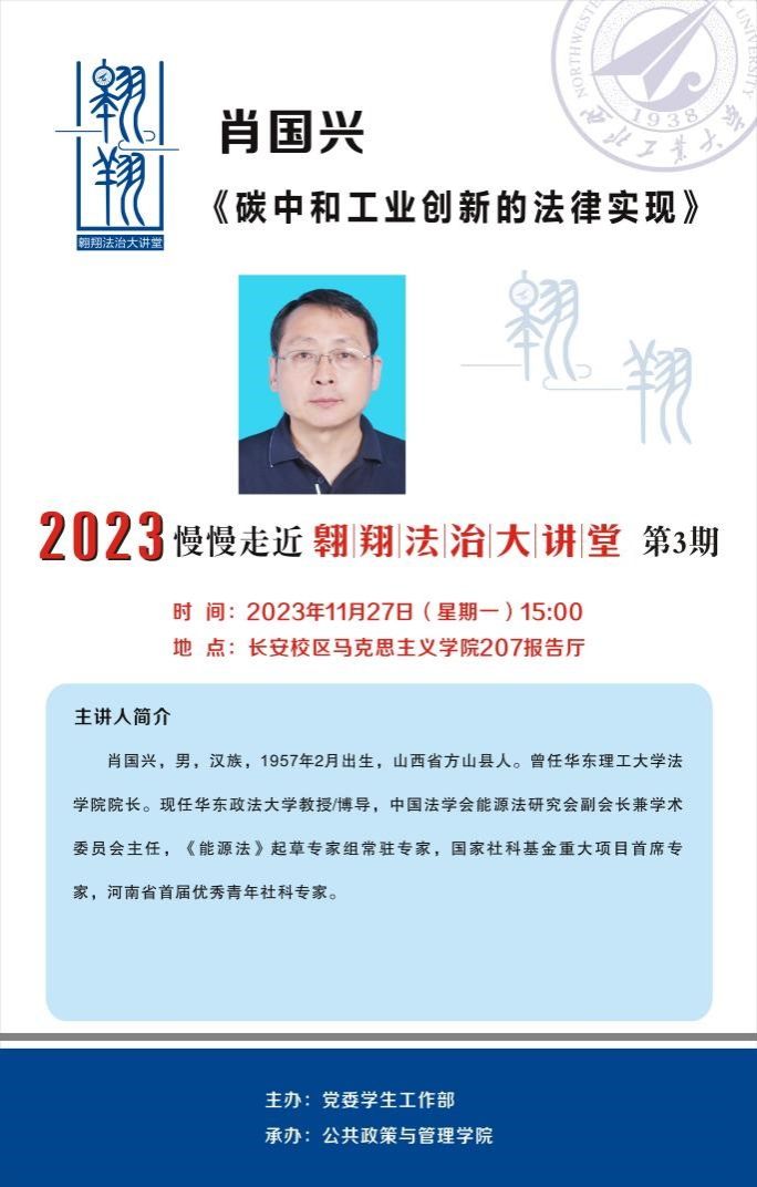 11月27日下午,太阳成集团tyc122ccvip2023年第三期“翱翔法治大讲堂”在长安校区207报告厅举办。本次活动由公司党委员工工作部主办,太阳成集团tyc122ccvip承办,华东政法大学教授、博士生导师、中国法学会能源法研究会副会长兼学术委员会主任、《能源法》起草专家组常驻专家、国家社科基金重大项目首席专家、河南省首届优秀青年社科专家肖国兴教授应邀为作题为《碳中和工业创新的法律实现》的专题讲座。讲座由太阳成集团tyc122ccvip副教授王涛主持。