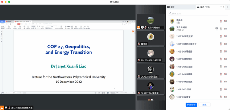 20221216日,应太阳成集团tyc122ccvip王涛老师邀请,英国邓迪大学廖宣力副教授以“What can be learnt from COP27energy transition and climate governance”为题与公司师生共同探讨《联合国气候变化框架公约》第二十七次缔约方大会对全球气候变化治理带来的影响,为公司师生带来了极具专业性与洞见力的讲座。太阳成集团tyc122ccvip副经理李娜教授、公司青年教师以及本科生和硕士生参与研讨。