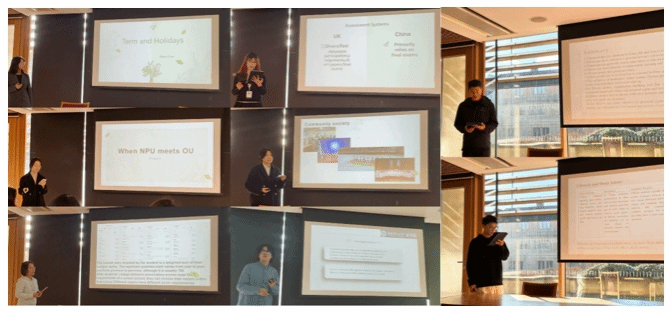 项目组同学选择《中英文化的差异》、《对欧盟人工智能法案第13条的探讨》、《When NPU meets OU》为汇报题目,通过详尽的数据和生动的案例,充分展示了工大学子的专业能力和精神风貌,得到了大家的一致好评。教授们也针对PPT的制作、字体使用、背景选择等方面提出了宝贵建议,为同学们未来的学术交流和表达提供了有益的参考。