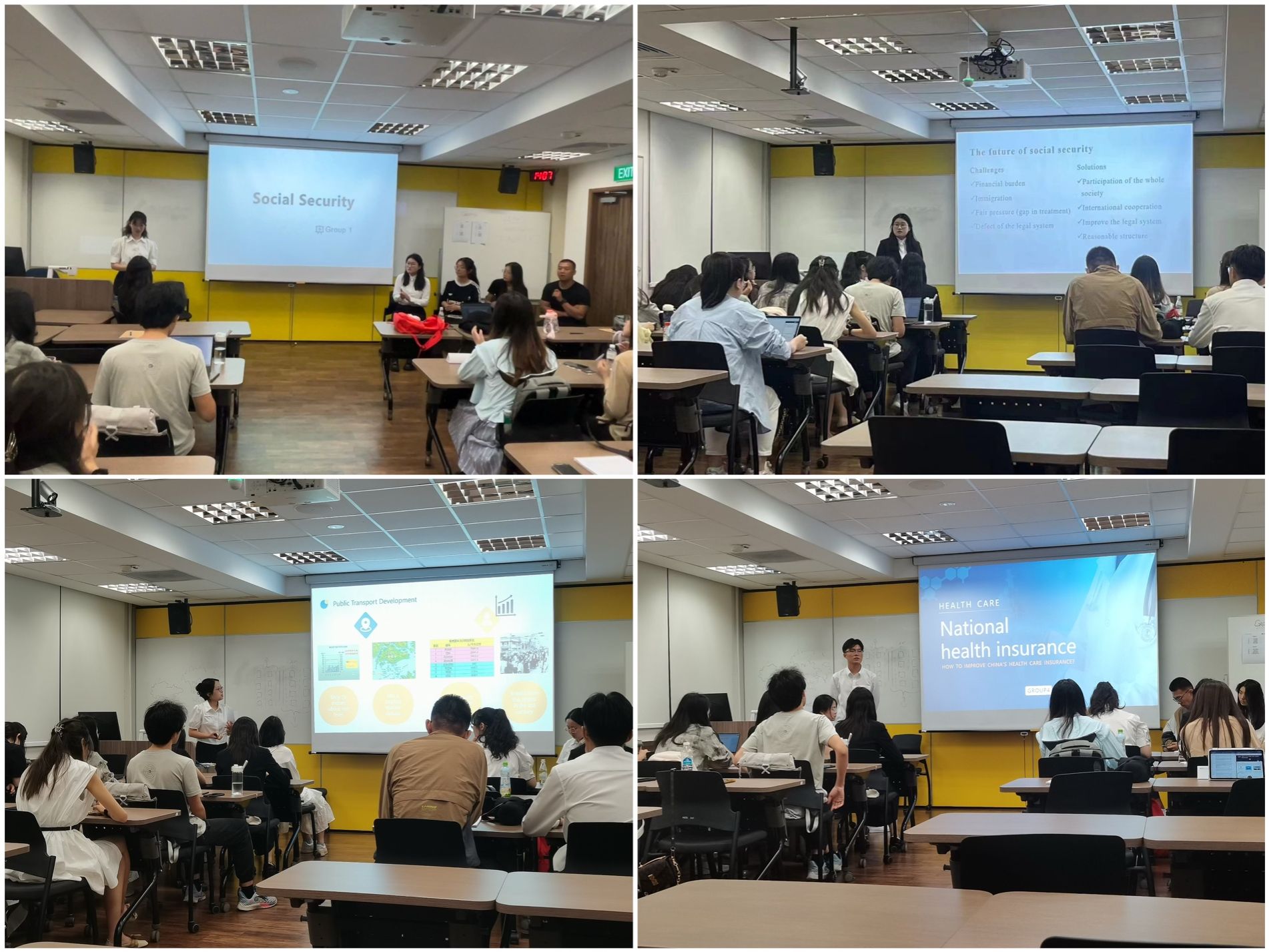 4个项目小组同学分别选择了“social security”“housing”“transportation”和“healthcare”为主题进行汇报,通过详尽的数据、生动的案例、高频的互动以及独到的见解,充分展示了工大学子的专业能力和精神风貌,得到了教授们的一致好评。同时,教授们也针对思考问题的逻辑切入点、分析方法和主题研讨做了更深层次的点评和指导,也对小组成员的汇报展示风格、语气语速等有关presentation的方面提出了宝贵建议,为同学们未来的学术交流和表达提供了有益的参考。